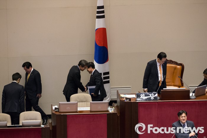 (서울=포커스뉴스) 테러방지법 직권상정에 반발해 야당이 무제한 토론(필리버스터)를 일주일째인 29일 오후 서울 여의도 국회 본회의장에서 토론에 참여한 홍익표 더불어민주당 의원이 발언 중인 가운데 정의화 국회의장이 정갑윤 국회부의장과 의장석을 교대하며 자리에 앉고 있다.