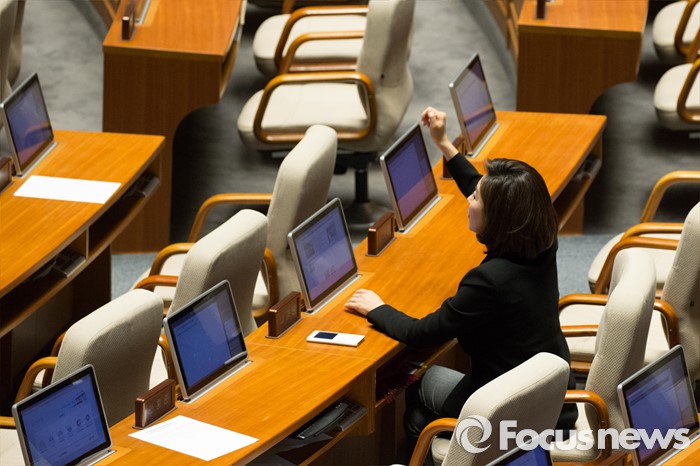 (서울=포커스뉴스) 테러방지법 직권상정에 반발해 야당이 무제한 토론(필리버스터)를 일주일째인 29일 오후 서울 여의도 국회 본회의장에서 토론에 참여한 홍익표 더불어민주당 의원이 발언하던 중 정갑윤 국회부의장에게 나경원 새누리당 의원이 질문하고 있다.