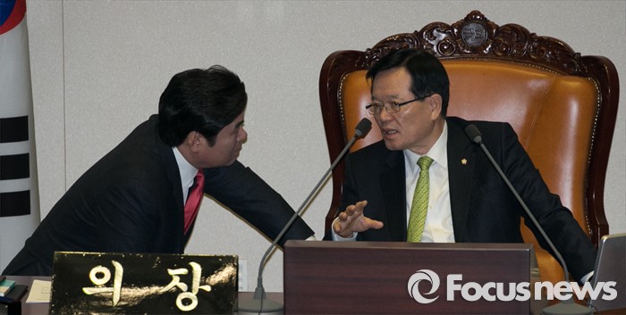 (서울=포커스뉴스) 테러방지법 직권상정에 반발해 야당이 세계 최장 기록의 필리버스터(무제한 토론)를 이어가고 있는 2일 오전 서울 여의도 국회 본회의장에서 토론에 참여한 이종걸 더불어민주당 원내대표의 발언 중에 정의화(오른쪽) 국회의장과 원유철 새누리당 원내대표가 대화하고 있다. 야당은 이날 필리버스터를 중단하고 선거법 등을 처리할 예정이다.