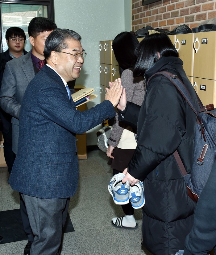 | △ 학생들과 인사하는 이재정 교육감 |