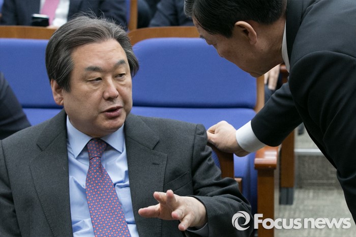 (서울=포커스뉴스) 김무성(왼쪽) 새누리당 대표와 황진하 사무총장이 2일 오전 서울 여의도 국회에서 열린 의원총회에 참석해 대화하고 있다.