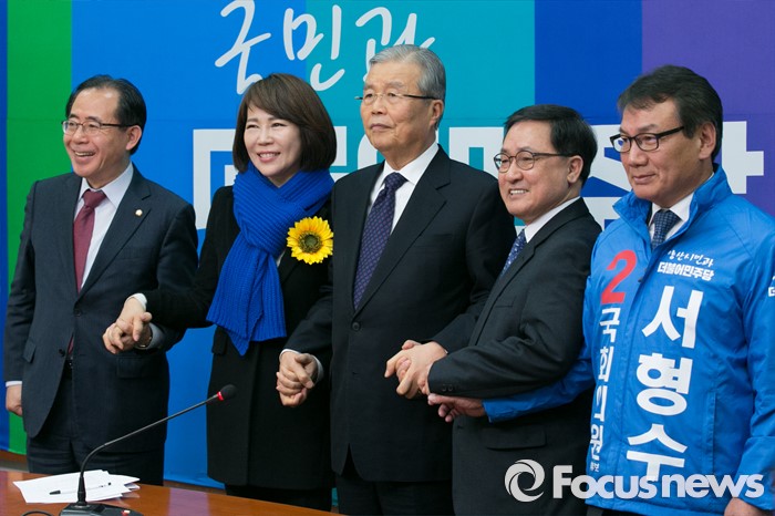 (서울=포커스뉴스) 김종인(가운데) 더불어민주당 비대위 대표와 김성곤(왼쪽) 전략공천위원장이 2일 오전 서울 여의도 국회에서 전략공천 명단 발표 기자회견에 참석해, 공천자들과 기념사진을 찍고 있다. 왼쪽부터 김 위원장, 전현희 전 의원(서울 강남을), 김 대표, 유영민 전 포스코 경영연구소 사장(부산 해운대갑), 서형수 전 한겨레신문 사장(경남 양산).