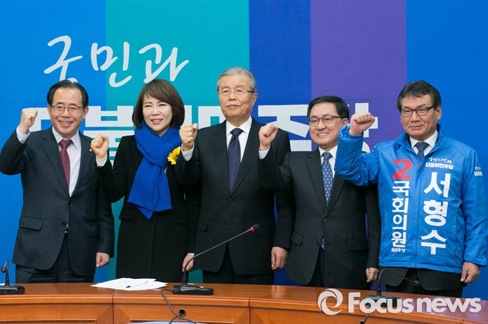 (서울=포커스뉴스) 김종인(가운데) 더불어민주당 비대위 대표와 김성곤(왼쪽) 전략공천위원장이 2일 오전 서울 여의도 국회에서 전략공천 명단 발표 기자회견에 참석해, 공천자들과 화이팅을 외치고 있다. 왼쪽부터 김 위원장, 전현희 전 의원(서울 강남을), 김 대표, 유영민 전 포스코 경영연구소 사장(부산 해운대갑), 서형수 전 한겨레신문 사장(경남 양산).