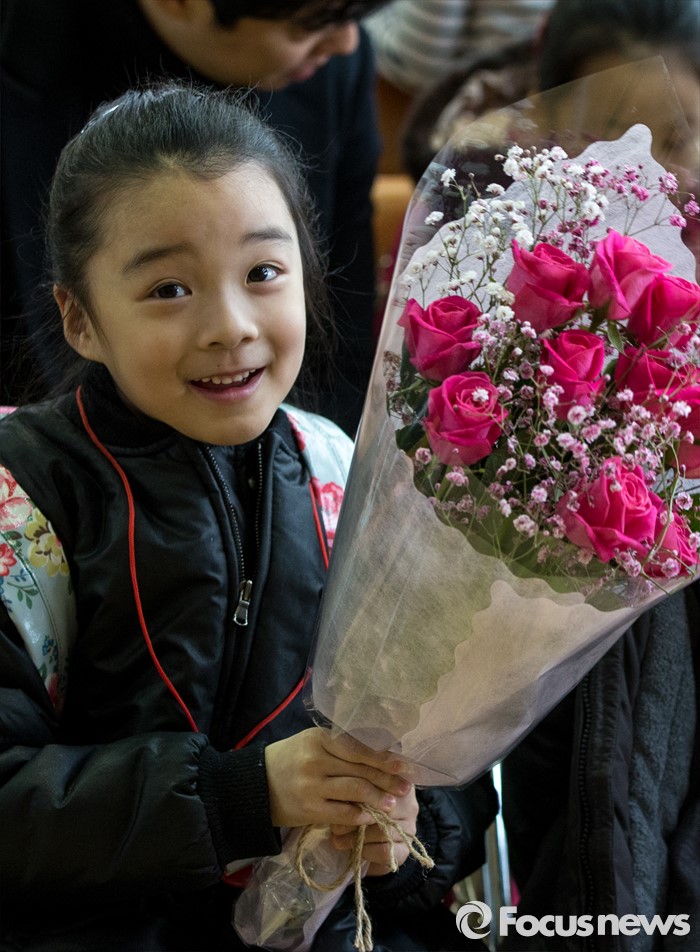 (서울=포커스뉴스) 2일 오전 서울 이태원 초등학교에서 열린 2016학년도 입학식에 참석한 신입생이 꽃다발을 들고 있다.
