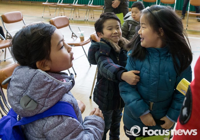 (서울=포커스뉴스) 2일 오전 서울 이태원 초등학교에서 열린 2016학년도 입학식에 참석한 신입생들이 대화하고 있다.