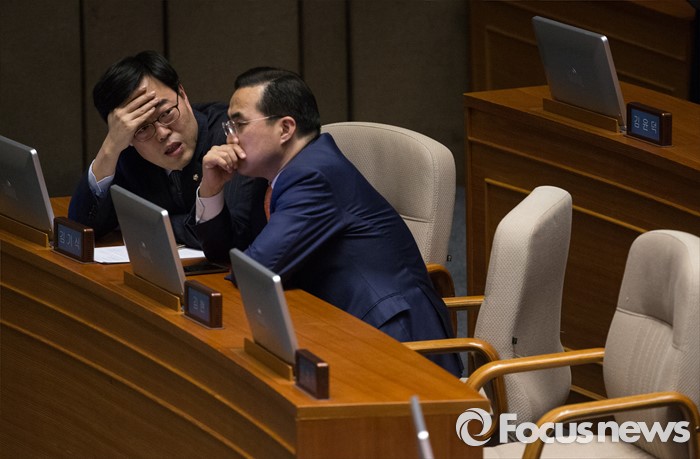 (서울=포커스뉴스) 테러방지법 직권상정에 반발해 야당이 세계 최장 기록의 필리버스터(무제한 토론)를 이어가고 있는 2일 오후, 서울 여의도 국회 본회의장에서 김기식 더불어민주당 의원이 동료 의원과 대화를 나누고 있다.