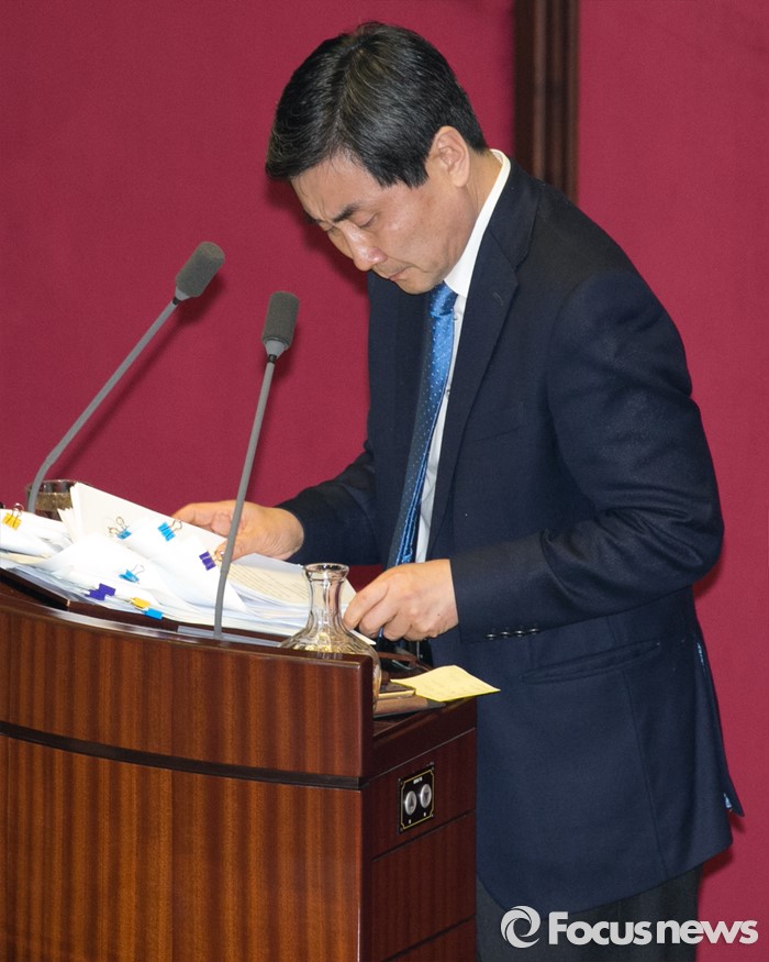 (서울=포커스뉴스) 테러방지법 직권상정에 반발해 야당이 세계 최장 기록의 필리버스터(무제한 토론)를 진행한 2일 오후 서울 여의도 국회 본회의장에서 마지막 주자인 이종걸 더불어민주당 원내대표가 토론을 마친 뒤 인사하고 있다. 마지막 주자로 나선 이 원내대표는 이날 정청래 의원의 기록인 11시간 40분을 경신한 12시간 31분을 기록하며 토론을 마쳤으며, 야당의 필리버스터는 약 193시간만에 종료됐다.