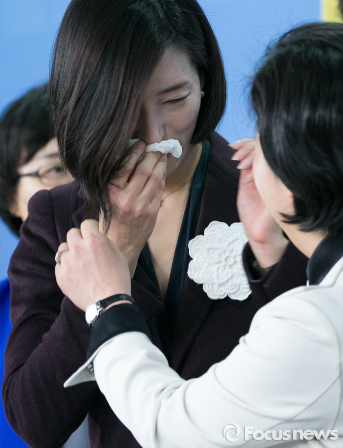 (서울=포커스뉴스) 더불어민주당의 영입인사인 김빈(본명 김현빈, 왼쪽) 디자이너가 3일 오전 서울 여의도 국회 정론관에서 20대 총선 청년 비례대표 후보 출마 기자회견을 마친 뒤 광주 서구을에 전략공천된 양향자 선대위원으로부터 격려받고 있다.