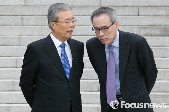 (서울=포커스뉴스) 김종인(왼쪽) 더불어민주당 비대위 대표와 주진형 총선정책공약단 부단장이 3일 오전 서울 여의도 국회 앞에서 열린 달리는 정책의자 발대식에 참석해 대화하고 있다.