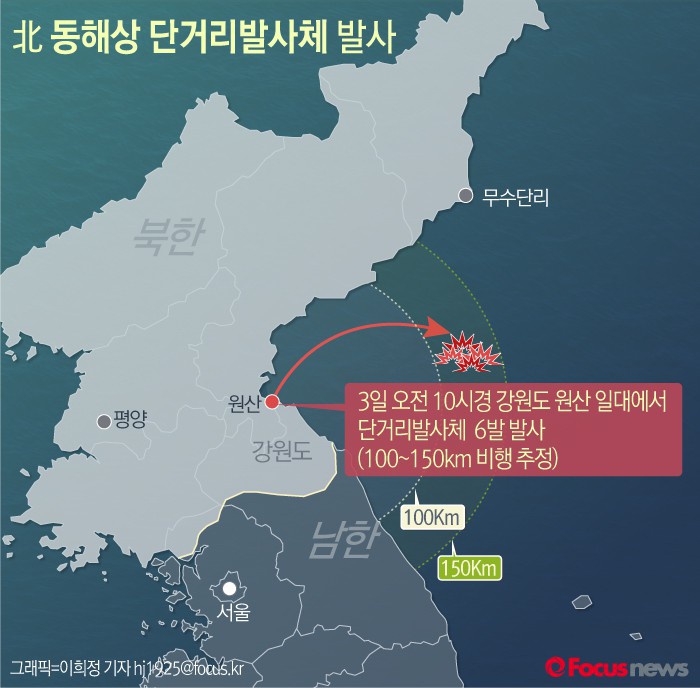 (☞ 북한, 3일 동해상 단거리 발사체 수발 발사(종합) - 기사 바로가기)