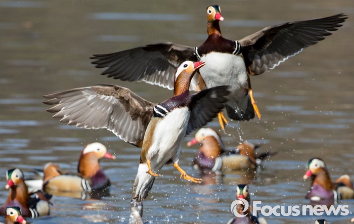 (서울=포커스뉴스) 동면하던 동물이 땅속에서 깨어난다는 경칩을 하루 앞둔 4일 오전 서울 종로구 창경궁 춘당지에서 원앙들이 봄의 기운을 알리듯 힘차게 날갯짓을 하고 있다.