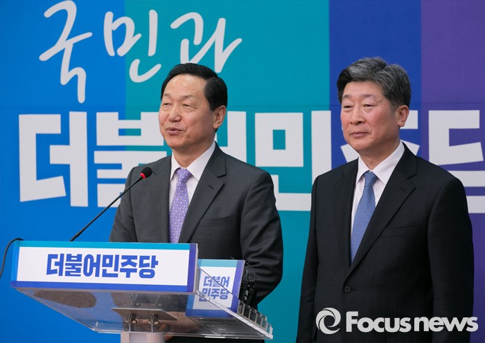 (서울=포커스뉴스) 4일 오후 서울 여의도 국회에서 열린 더불어민주당 인재영입 기자회견에 참석한 김상곤(왼쪽) 인재영입위원장이 인사말을 하고 있다. 오른쪽은 입당한 윤종기 전 인천경찰청장.