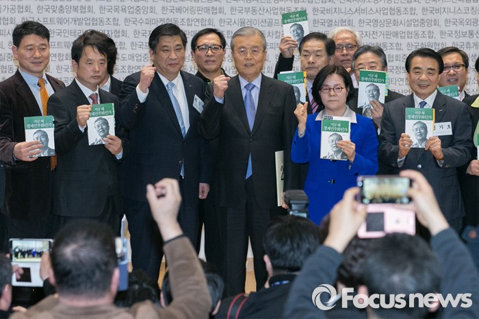 (서울=포커스뉴스) 김종인(왼쪽 다섯번째) 더불어민주당 비대위 대표가 4일 오후 서울 여의도 국회 의원회관에서 열린 소상공인 20대 총선 정책공약 전달식에 참석해, 김 대표의 저서를 든 소상공인 대표들과 화이팅을 외치고 있다.