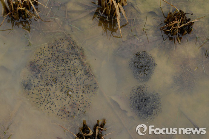 (영암=포커스뉴스) 전국적으로 봄비가 내리고 절기상경칩인 5일 전남 영암군 영암읍 월출산 자락의 계단논에 겨울잠에서 깨어난 산개구리들이 산란한 알이 뭉쳐 있다. <사진제공=김현태 양서류연구가>
