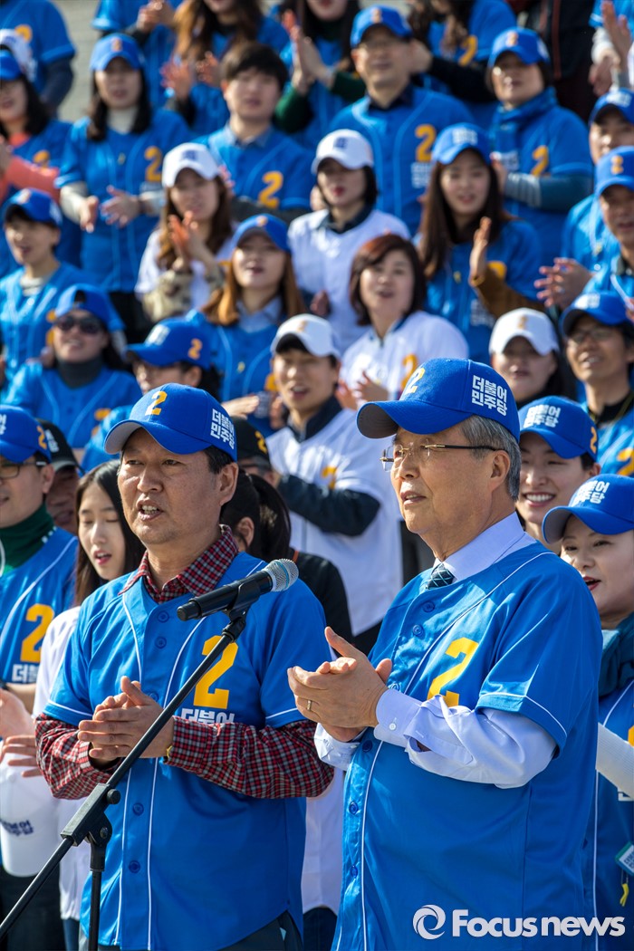 (서울=포커스뉴스) 김종인 더불어민주당 비상대책위원회 대표와 정청래 더불어민주당 의원을 비롯한 당원들이 6일 오후 서울 영등포구 국회 본관 앞에서 열린 '더불어민주당 총선 응원가 뮤직비디오 촬영'에 참여해 응원가를부르고 있다.