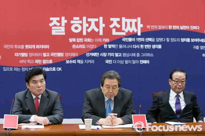 (서울=포커스뉴스) 김무성(가운데) 새누리당 대표와 원유철(왼쪽) 원내대표, 서청원 최고위원이 7일 오전 서울 여의도 국회에서 열린 최고위원회의에 참석해 자리에 앉아 있다.