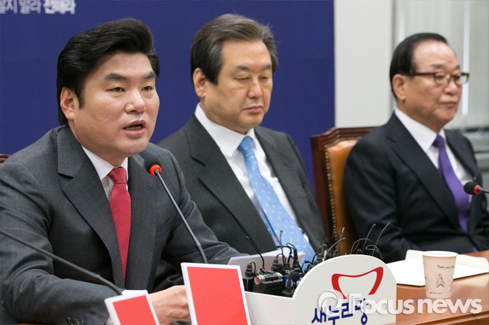 (서울=포커스뉴스) 원유철(왼쪽) 새누리당 원내대표가 7일 오전 서울 여의도 국회에서 열린 최고위원회의에 참석해, 모두발언하는 동안, 김무성(가운데) 대표, 서청원 최고위원이 경청하고 있다.
