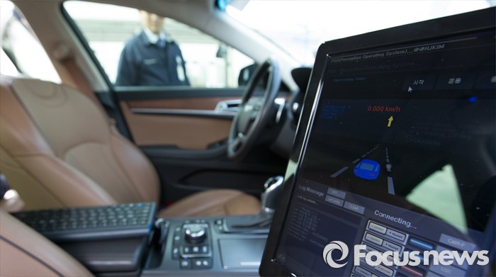 (세종=포커스뉴스) 7일 오전 세종시 정부세종청사 국토교통부 앞에서제1호 자율주행차 시험운행 허가 및 시연이 열린 가운데 현대 제네시스가 국내 자율주행차 임시운행 제1호차로 허가받고 도로주행을 시작했다. 사진은 자율주행 시험차량.