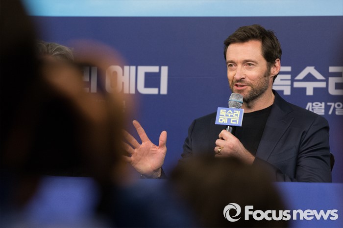 | △ 취재진 질문에 답하는 배우 휴잭맨 |