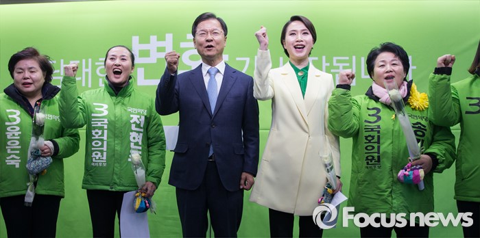 △ 화이팅 외치는 천정배 의원과 여성 후보들