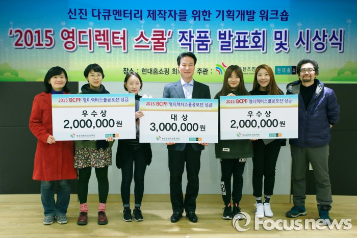 강찬석 현대홈쇼핑 대표는 “영디렉터스쿨을 신설함으로써 방송학과 대학생 장학금 지원과 제작환경이 열악한 중소제작사를 지원하는 그린다큐 공모전까지 총 3단계에 걸쳐 방송 콘텐츠 지원 사업을 하게 됐다”며 “지원금 전달 뿐만 아니라 콘텐츠 제작 환경 개선을 통해 국내 영상 산업을 발전시킬 수 있도록 최선을 다할 것”이라고 말했다.8일 현대홈쇼핑 사옥에서 제1회 영디렉터스쿨 공모전 수상자 3명이 상금을 전달받은 후 기념촬영을 하고 있다.<사진제공=현대홈쇼핑>