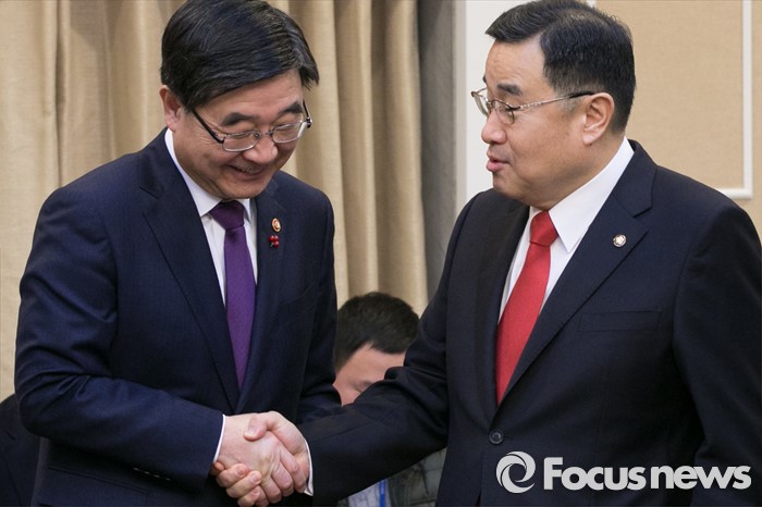 이날 민당정 간담회에는 김정훈 정책위의장, 조원진 원내수석부대표, 이기권 고용노동부 장관과 이동근 대한상공회의소 상근부회장, 이승철 전국경제인연합회 상근부회장 등 경제 5단체 소속 인사들이 참석한다.김정훈(오른쪽) 새누리당 정책위의장과 이기권 고용노동부 장관이 26일 오전 서울 여의도 국회 귀빈식당에서 열린 '임금 체불 및 하도급대금 부조리 해결' 합동 당정협의에 참석해 악수하고 있다. 2016.01.26 박철중 기자