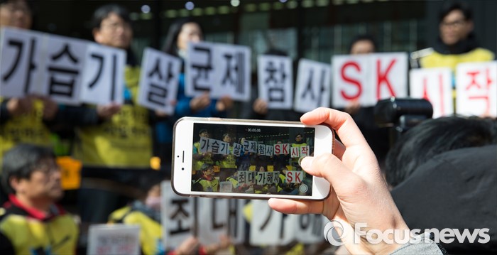 (서울=포커스뉴스) 9일 오전 서울 종로구 SK서린빌딩 앞에서 환경보건시민센터를 비롯한 가습기살균제피해자와가족모임 회원들이 '가습기살균제 피해 관련 고발 기자회견'을 하고 있다.