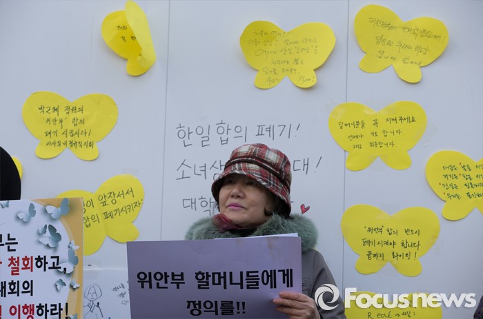 (서울=포커스뉴스) 9일 오후 서울 종로구 옛 주한일본대사관 앞에서 한국정신대문제대책협의회, 학생들을 비롯한 참석자들이 '제1221차 일본군 위안부 문제해결을 위한 정기 수요시위'를 하고 있다.