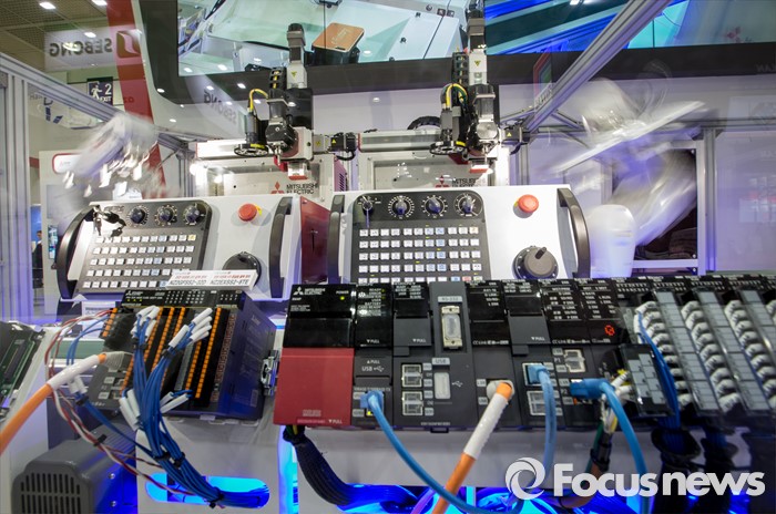 (서울=포커스뉴스) 9일 오후 서울 강남구 코엑스에서 열린 '오토메이션 월드 2016’ 한국미쓰비시전기 오토메이션 부스에서 스카라로봇을 이용한 제품생산 과정이 시연되고 있다.