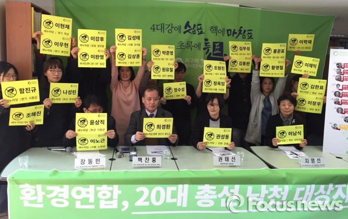 (서울=포커스뉴스) 4·13총선을 앞두고 환경운동연합이 9일 낮 1시 30분 서울 종로구 누하동 환경운동연합에서 기자회견을 열고 반환경 인사 27명을 총선 낙천 대상자로 선정 및 발표했다.