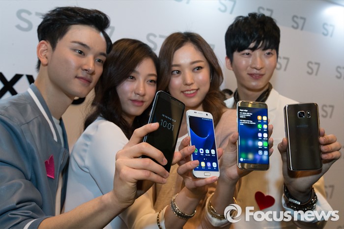 (서울=포커스뉴스) 10일 오전 서울 중구 신라호텔에서 삼성전자의 스마트폰 '갤럭시 S7 엣지와 갤럭시 S7'을 모델들이 선보이고 있다. 이번 제품은 듀얼 픽셀과 F1.7 조리개 탑재, 방수·방진과 대용량 배터리가 탑재되어 있다.