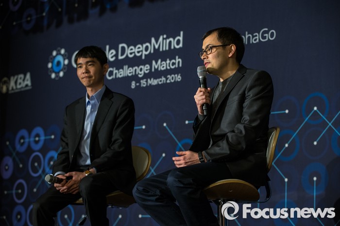 (서울=포커스뉴스) 프로바둑기사 이세돌 9단이 10일 오후 서울 종로구 포시즌스 호텔에서 열린 '구글딥마인드 챌린지 매치' 인공지능 '알파고'와의 제2국에 불계패를 당한 뒤 기자회견을 하고 있다. 사진 오른쪽은 데미스 하사비스 구글 딥마인드 최고경영자.