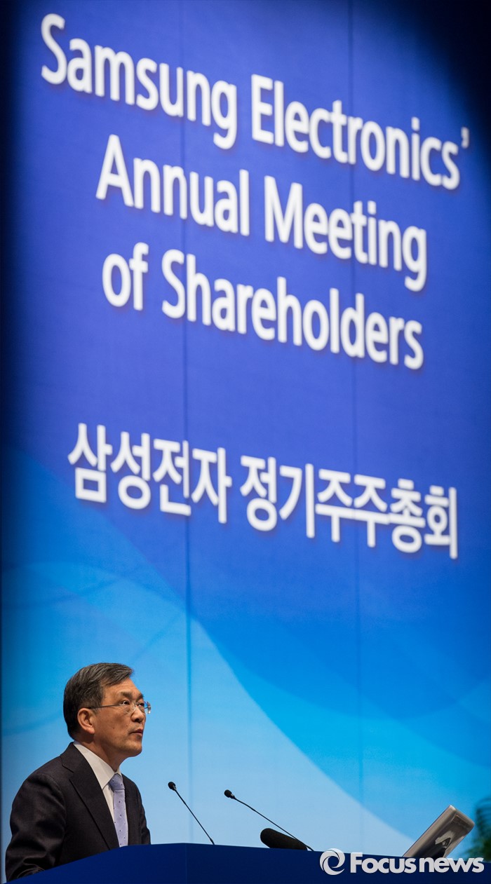 (서울=포커스뉴스) 11일 오전 서울 서초구 삼성전자 본사 다목적홀에서 열린 47기 정기주주총회에 참석한 권오현 이사회 의장(대표이사 부회장)이 인사말을 하고 있다.