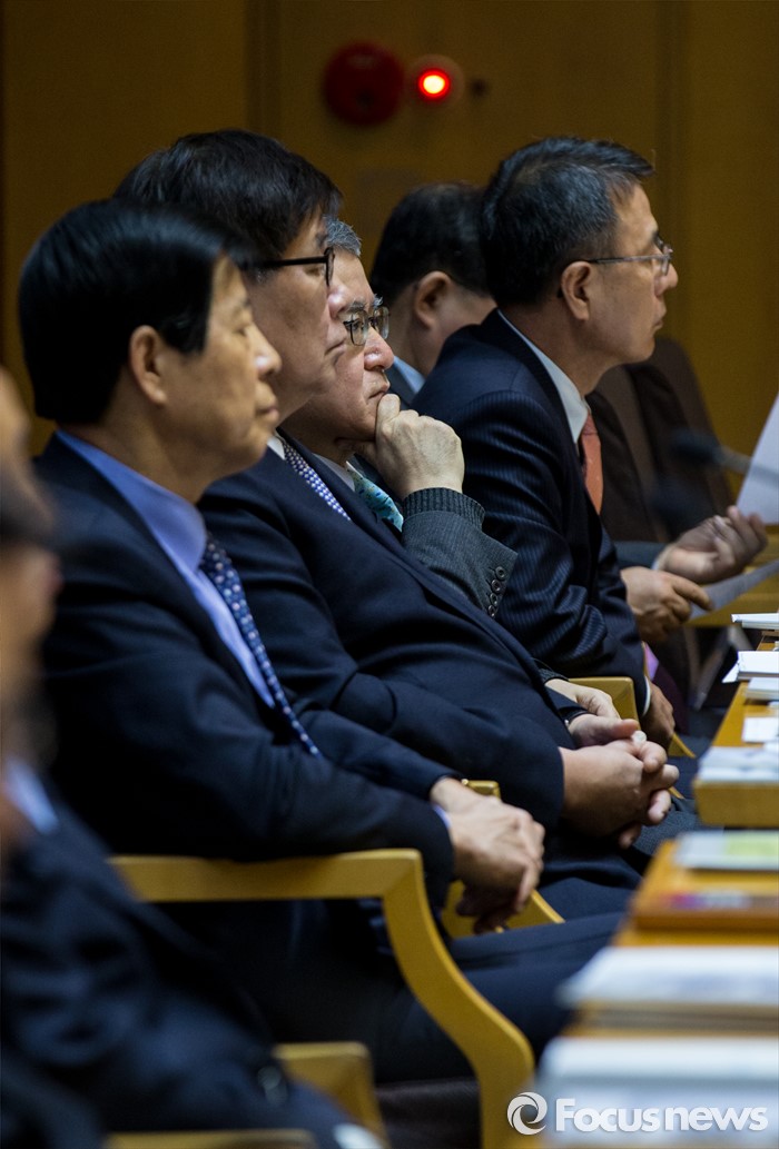 (서울=포커스뉴스) 11일 오전 서울 강남구 포스코센터에서 열린 정기주주총회에 참석한 이사진이 권오준 포스코 회장의 인사말을 듣고 있다.