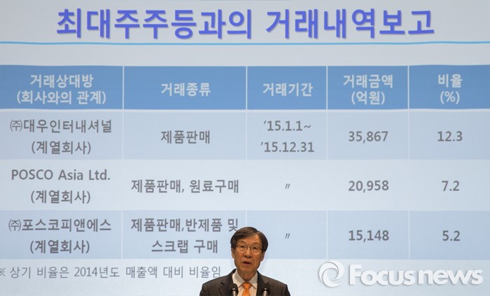 (서울=포커스뉴스) 11일 오전 서울 강남구 포스코센터에서 열린 정기주주총회에 참석한 권오준 포스코 회장이 최대주주등과의 거래내역을 주주들에게 보고하고 있다.