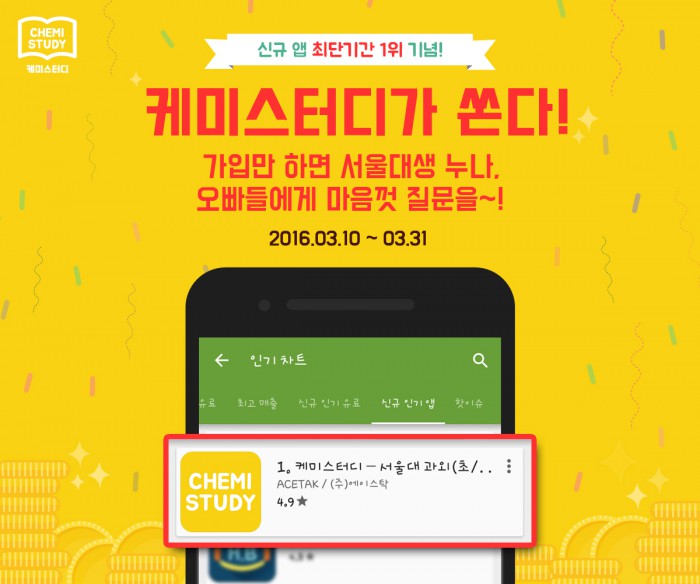 한편, 케미스터디에선 신규인기앱 1위를 기념해 오는 31일까지 회원가입 시 100 '케미'를 지급하는 이벤트를 진행한다. '케미'는 케미스터디 앱 내에서 서울대생 튜터들에게 모르는 것을 질문할 때 쓸 수 있다.과외앱 '케미스터디'가 구글스토어 교육카테고리 신규 인기앱 부문에서 최단기간 1위에 올랐다.<사진제공=에이스탁>