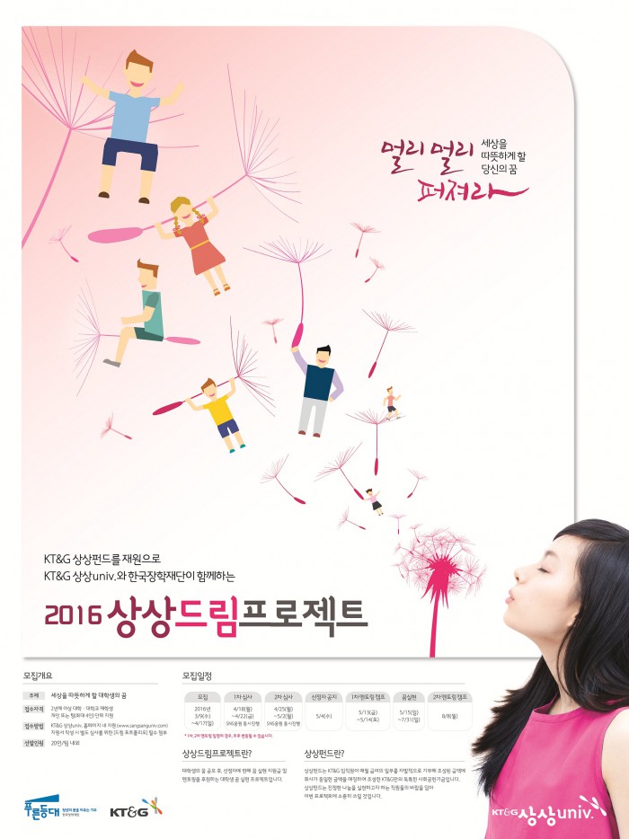KT&G 관계자는 "이번 프로그램에 패기와 열정있는 대학생들이 많이 참여해 꿈을 실현하고 한 단계 성장할 수 있는 기회가 되길 희망한다"고 밝혔다.'2016 상상드림프로젝트' 참가자 모집 포스터.<사진제공=KT&G>