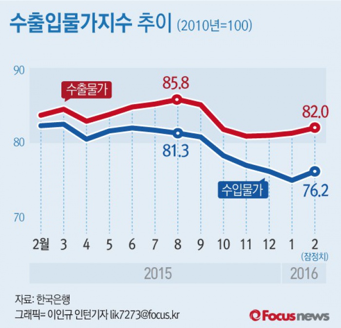 (서울=포커스뉴스) 14일 한국은행이 발표한 ‘2월 수출입물가지수'를 보면 지난달 수입물가는 76.16으로 전월대비 1.6% 올랐다. 수출물가는 81.99로 전월 대비 0.8% 올랐다.