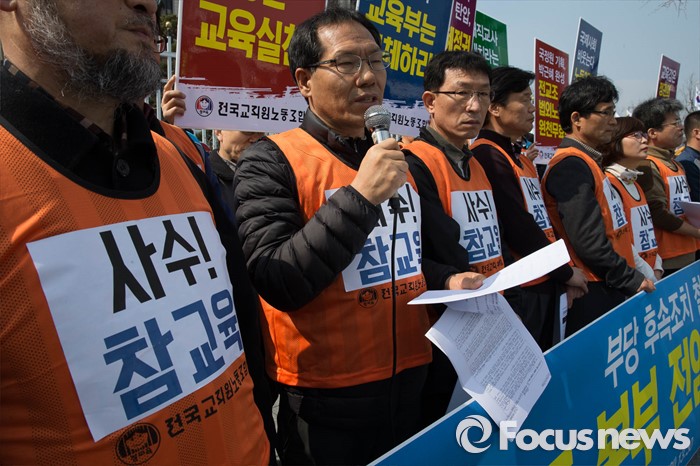 (서울=포커스뉴스) 14일 오후 서울 종로구 정부서울청사앞에서 전국교직원노동조합원 및 관계자들이 법외노조 판결에 대한 교육당국의 후속조치 철회를 촉구하며 삭발을 하고 있다.