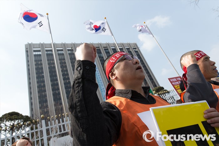 (서울=포커스뉴스) 14일 오후 서울 종로구 정부서울청사 앞에서 전국교직원노동조합 전임자들이 정부의 법외노조 후속조치와 부당탄압에 항의하는 삭발식 후 구호를 외치고 있다.