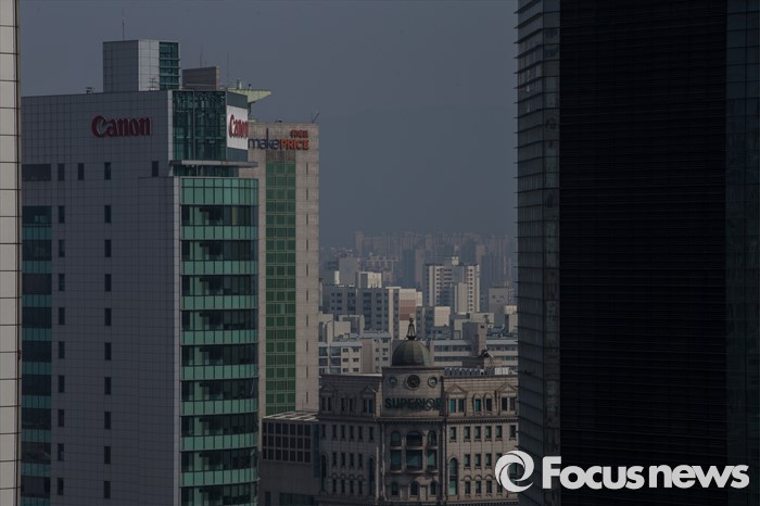 (서울=포커스뉴스) 서울 한 낮 기온이 11도까지 상승한 14일 오후 서울 강남구에서 바라본 도심에 보통 수준의 미세먼지가 끼어 있다.