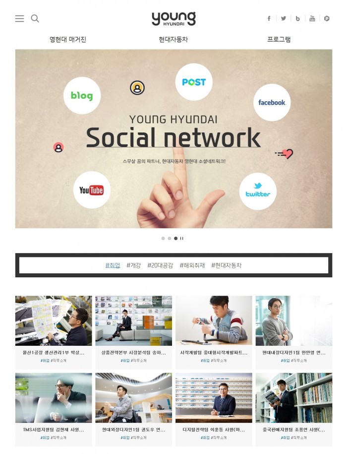 현대차는 영현대 홈페이지를 통해 △20대가 공감할 수 있는 다채로운 콘텐츠를 비롯 △홍보,마케팅, R&D 등과 관련된 다양한 기업 소식 △현대차 및 그룹에서 운영하는 20대 대상 프로그램에 대한 정보를 제공해 젊은층과 소통을 한층 더 강화해 나갈 예정이다.