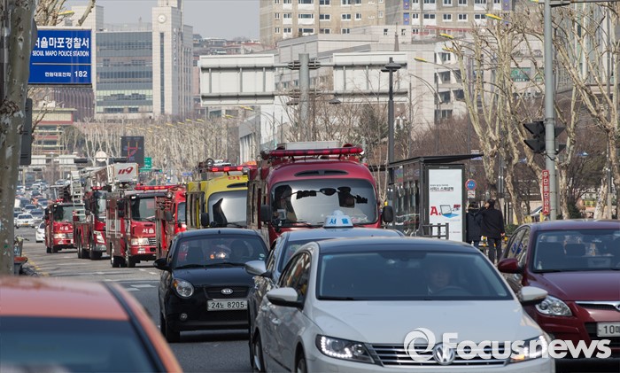 (서울=포커스뉴스) 올해 첫 민방위 훈련이 실시된 15일 오후 서울 마포대로 일대에서 마포소방서 소속 소방차가 길터주기 국민참여 훈련을 하고 있다.