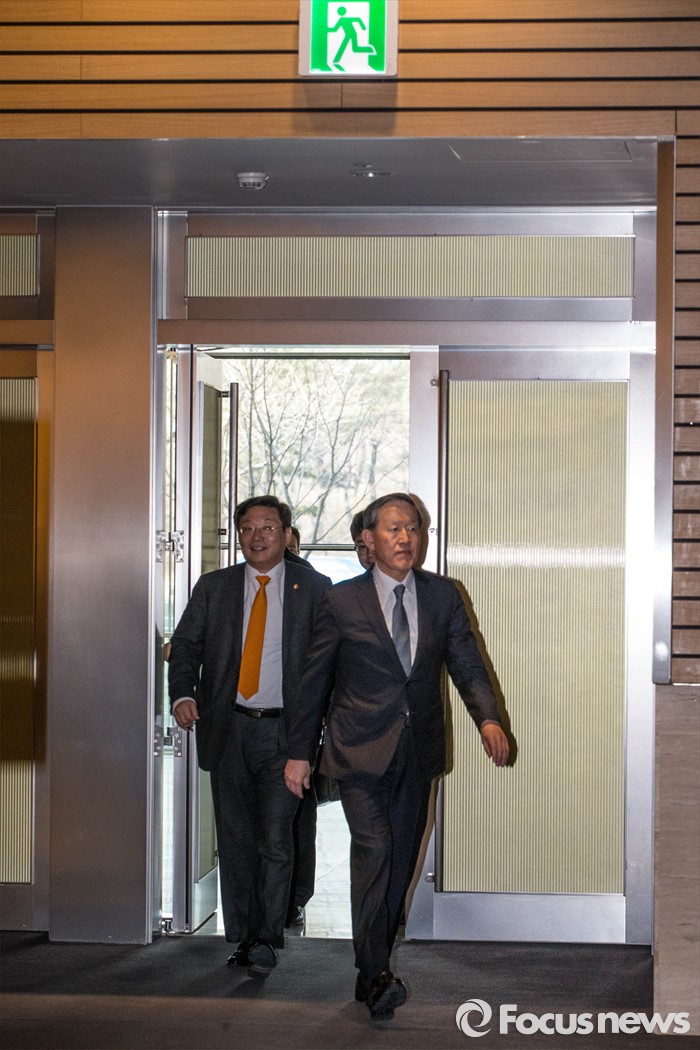 | △ 해외진출성과 토론회 참석하는 주형환-허창수 |