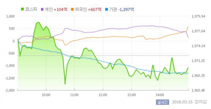 15일 코스피지수는 전일 대비 0.12%(2.30포인트) 내린 1969.97에 장을 마쳤다. 코스닥지수는 전날보다 0.33%(2.29포인트) 오른 693.34에 마감했다.