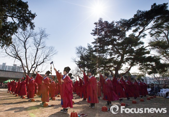 (서울=포커스뉴스) 16일 오전 서울 종로구 성균관 대성전에서 열린 '2016 춘기석전대제'에서 일무보존회 회원들이 일무를 추고 있다.