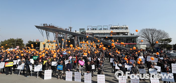 (파주=포커스뉴스) 16일 오후 경기도 파주시 임진각 망배단에서 개성공단 입주기업, 영업기업, 협력기업 등 대표를 비롯한 임직원과 가족들이 '개성공단 평화대행진 집회'를 하고 있다.