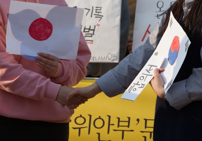 (청주=포커스뉴스) 16일 오후 충북 청주시 청원구 청주대학교 정문 앞에서 열린 일본군 위안부 문제 해결을 위한 1222차 학내 동시다발 수요시위에서 학생들이 한일 위안부 합의를 반대하는 퍼포먼스를 하고 있다.