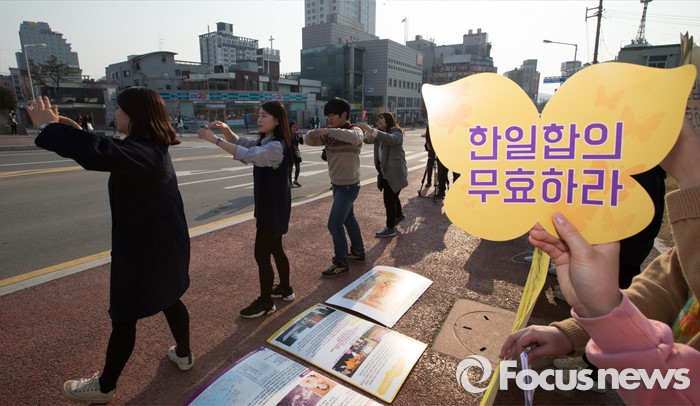 (청주=포커스뉴스) 16일 오후 충북 청주시 청원구 청주대학교 정문 앞에서 열린 일본군 위안부 문제 해결을 위한 1222차 학내 동시다발 수요시위에서 학생들이 한일 위안부 합의를 반대하는 퍼포먼스를 하고 있다.