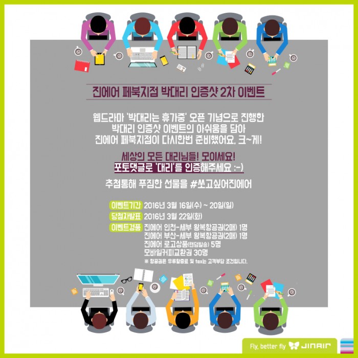 20일까지 진행되는 '세상의 모든 대리 인증샷' 은 직장 내 직급이 '대리'인 경우 사원증이나 명함 등을 진에어 페이스북 페이지에 인증하는 이벤트다. 추첨을 통해 인천-세부 왕복항복권(1명), 부산-세부 왕복항공권(1명), 여권 케이스 등 로고 상품(5명), 모바일 커피 교환권(30명) 등을 선물로 증정한다.